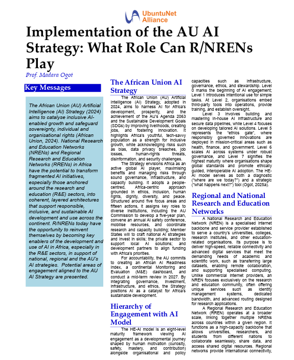 The African Union Artificial Intelligence Strategy (2024) aims to catalyse inclusive AI-enabled growth and safeguard sovereignty, individual and organisational rights. NRENs and RRENs in Africa have the potential to transform fragmented AI initiatives, especially those anchored around the R&E sectors, into coherent, layered architectures that support responsible, inclusive, and sustainable AI development and use across the continent. Download here (English)